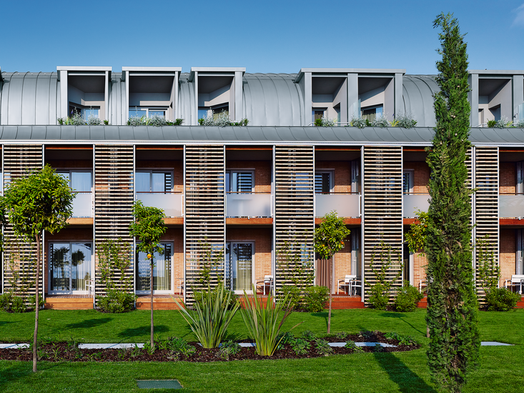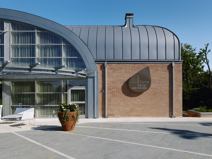 Hotel Corte ValierLazise, ItalienBygherreFuturum srl Lazise ItalienUdførende arkitektStefano Feriotti Verona ItalienHåndværksmæssig udførelseP-Dach Egna ItalienTekniske data Tag: 3.000 m²20 t System med stående dobbeltfals RHEINZINK-prePATINA blaugrauCopyright fotoRHEINZINKDatabladeKontakt