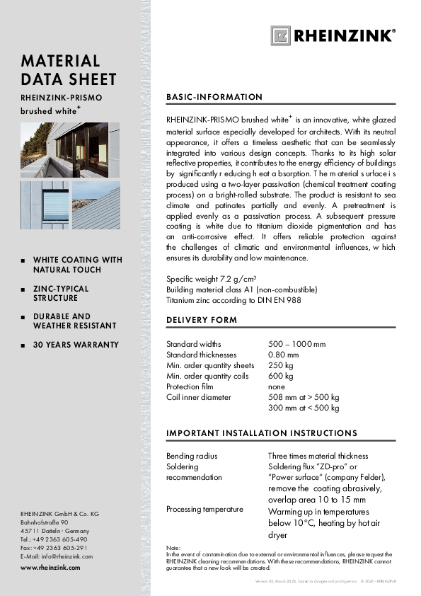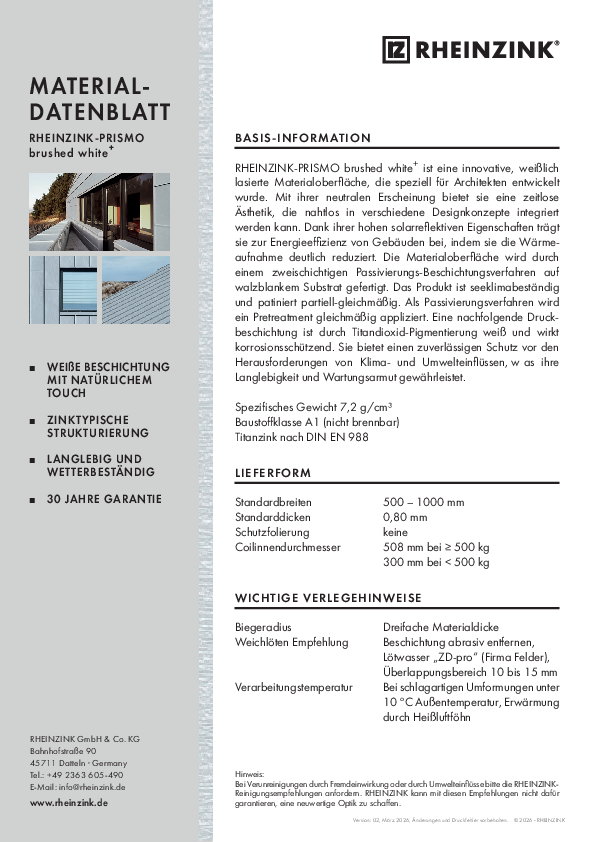 Resultattype Download Søg Aktiver Filter: Download Fjern alle filtre 12345næste RHEINZINK-PRISMO brushed white+ Materialdatenblatt pdf 277 KB RHEINZINK-PRISMO brushed white+ Material data sheet pdf 279 KB Falseteknik håndbog Falseteknik håndbog FALSETEKNIK Håndbog PLANLÆGNING OG ANVENDELSE FALSETEKNIK, PLANLÆGNING OG ANVENDELSE 1. 1.1 1.2 1.3 1.4 1.5 1.6 1.7 1.7.1 1.7.2 MATERIALET Indledning Legering og… pdf 2 MB ZINC is a building block of life Figures, Data, Facts pdf 1 MB Zink ist ein Baustein des Lebens Zahlen, Daten, Fakten pdf 1 MB RHEINZINK Product Lines Information on Material and Processing pdf 792 KB RHEINZINK-Produktlinien Hinweise zu Material und Verarbeitung pdf 7 MB Umwelt-Produktdeklaration RHEINZINK-prePATINA blaugrau + schiefergrau IBU EPD pdf 1 MB Umwelt-Produktdeklaration RHEINZINK-CLASSIC walzblank IBU EPD pdf 1 MB Factsheet RHEINZINK-prePATINA ECO ZINC Factsheet RHEINZINK-prePATINA ECO ZINC PROPERT Y Leuphana University, Lüneburg, Germany ARCHITECT OF DESIGN Studio Libeskind, New York, USA EXECUTIVE ARCHITECT rw+ Architekten GmbH,… pdf 10 MB 12345næste