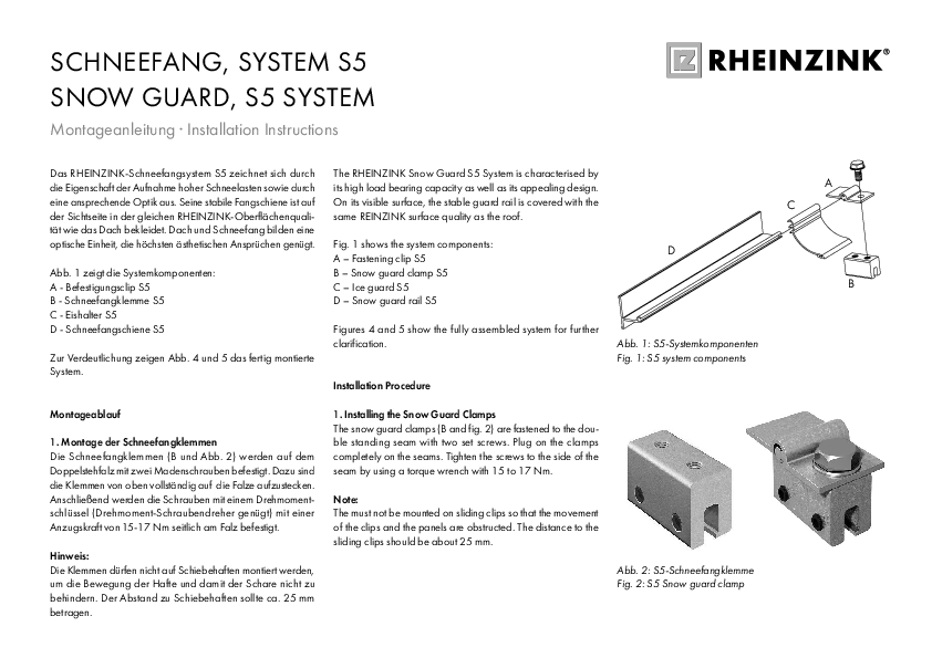 SCHNEEFANG, SYSTEM S5 SNOW GUARD, S5 SYSTEM Montageanleitung · Installation Instructions Das RHEINZINK-Schneefangsystem S5 zeichnet sich durch die Eigenschaft der…
