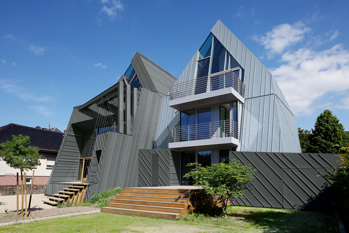 … først sin typiske, blågrå farve efter længere tids udsættelse for vind og vejr, men arkitekterne ytrede ønske om levering af materialet i en forpatineret udgave.